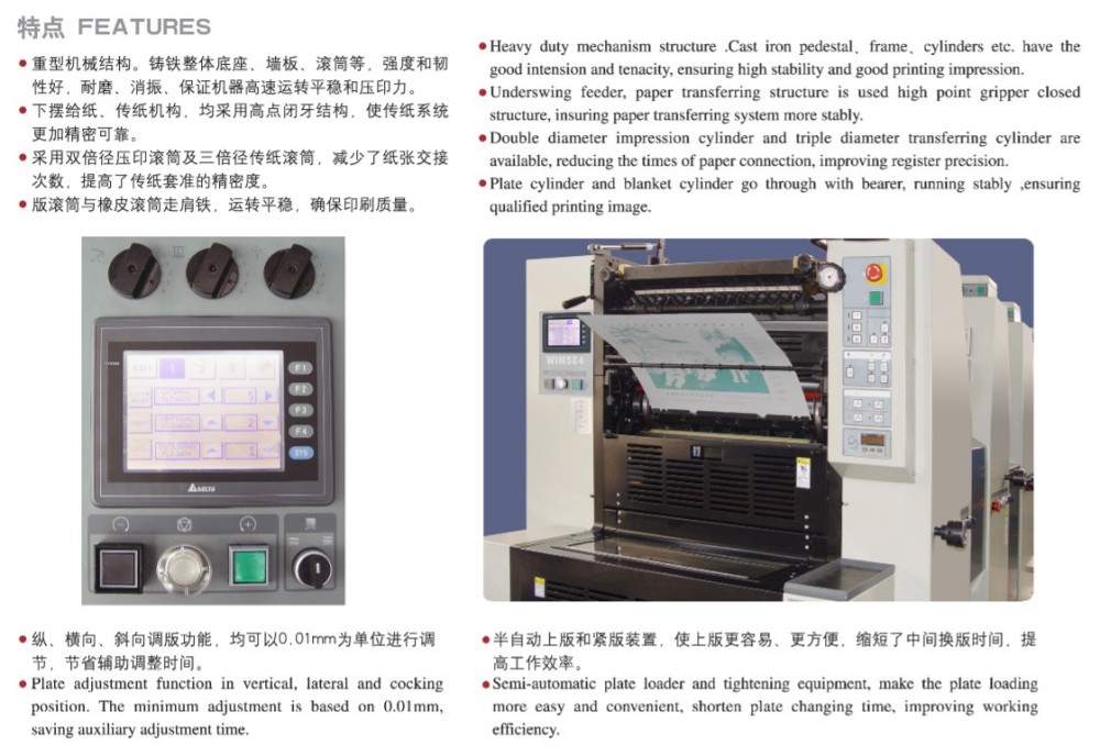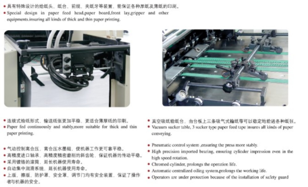ठूलो A3 फोर-रङ प्याकेजिङ प्रिन्टिङ अफसेट प्रिन्टिङ प्रेस उच्च-प्रदर्शन मोड्युलहरूसँग डिजाइन गरिएको छ, र ती सबै उच्च गुणस्तरका छन्—उच्च-परिशुद्धता रोलर र गियरहरू, एक बलियो कागज फिडिङ मेकानिज्म, उच्च-परिशुद्धता कागज दर्ता प्रणाली, र एक स्थिर मसी आपूर्ति प्रणाली। यो उच्च-गुणस्तर, कुशल र किफायती कट-शीट रंग मुद्रणको लागि बजारको आवश्यकताहरू पूरा गर्न तयार गरिएको छ। तपाईले एउटा कागजको मोटाईमा टाँस्नु पर्दैन, या त - यसले पातलो कागज (०.०४ मिमी) सँग बाक्लो कार्डबोर्ड (०.४ मिमी) सम्म काम गर्छ। त्यहाँ एक सहज प्रोग्रामिङ इन्टरफेसको साथ टचस्क्रिन नियन्त्रण पनि छ, जसले तपाईंलाई सेटिङहरू र प्रिन्टिङ प्यारामिटरहरूलाई स्मार्ट, सीधा तरिकामा समायोजन गर्न दिन्छ।
